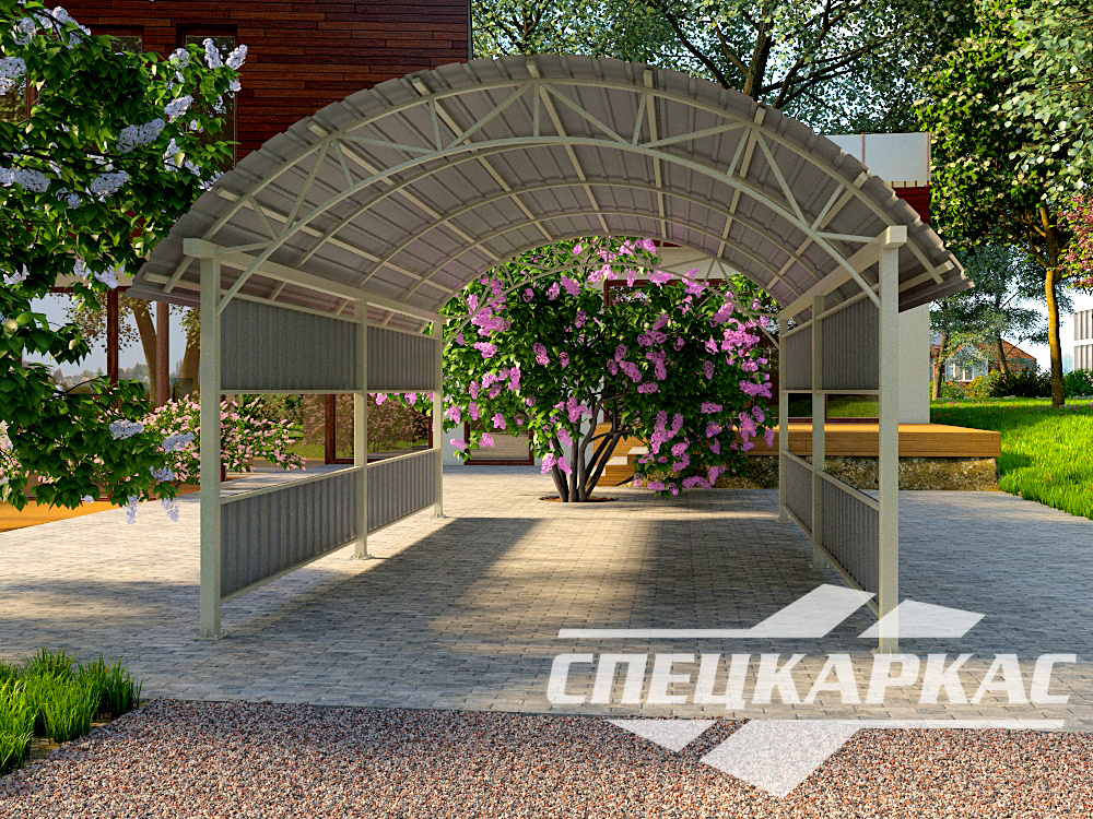 Компания «Спецкаркас» предлагает козырьки, беседки, навесы из поликарбоната любого типа и формата: одно- и двухскатные, прямые и наклонные, арочные и даже куполообразные.